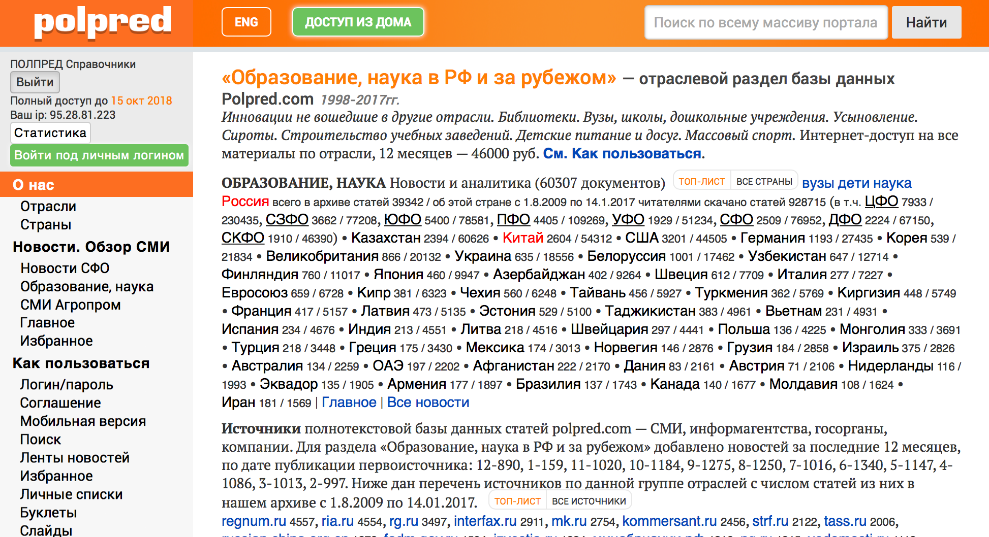 У каждого отраслевого polpred-сайта есть поддомен, education.polpred.com у «Образования и науки». Это имя удобно запомнить и добавить в закладки, если вы интересуетесь данной тематикой. На сайтах представлены: новости по отрасли; источники полнотекстовой базы данных статей — СМИ, информагентства, госорганы, компании; персоны, т.е. ньюсмейкеры, эксперты, первые лица; международные сайты.